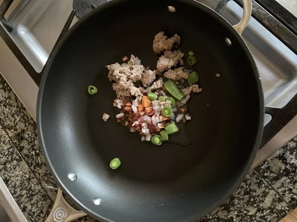 Segregate items by category or when they will be used in the process. If cooking, measure ingredients into prep cups then sequentially line them up. For example, I started the longer cook-time veggies first, followed by the rapid cookers, then the eggs. As each prep cup is used, stack them, rinse them, or stow in the dishwasher. Just get them out of the way.